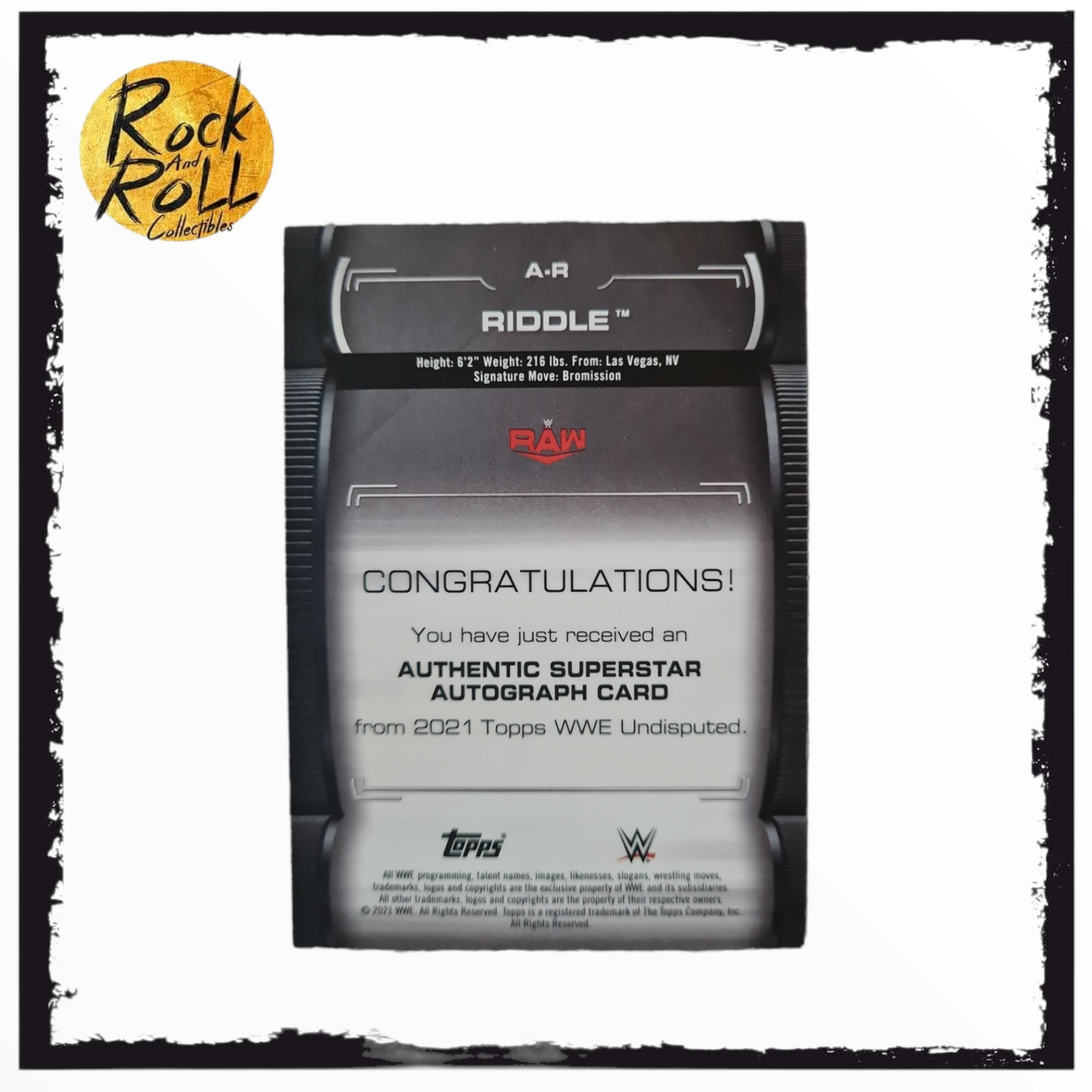 Riddle 2021 Topps WWE Undisputed Autograph Auto /199. Card is signed not a sticker.